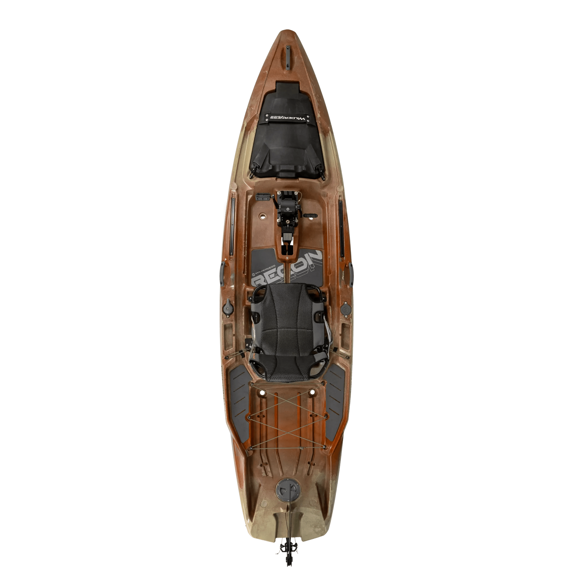 Que vous soyez novice ou expert, le Recon est un kayak de pêche pré-équipé que vous pouvez personnaliser. Avec une plateforme ouverte entièrement personnalisable, un siège AirPro ACES pivotant à 360 degrés, et la liberté de choisir le mode de propulsion préféré - pagaie, pédale, ou moteur - la série de kayaks Recon offre une pêche en toute confiance. (Remarque : Ce modèle est livré avec le système de propulsion à pédale Helix PD™ déjà installé.) Des moteurs après-vente peuvent également être installés avec une interface de montage direct à l'arrière du bateau.